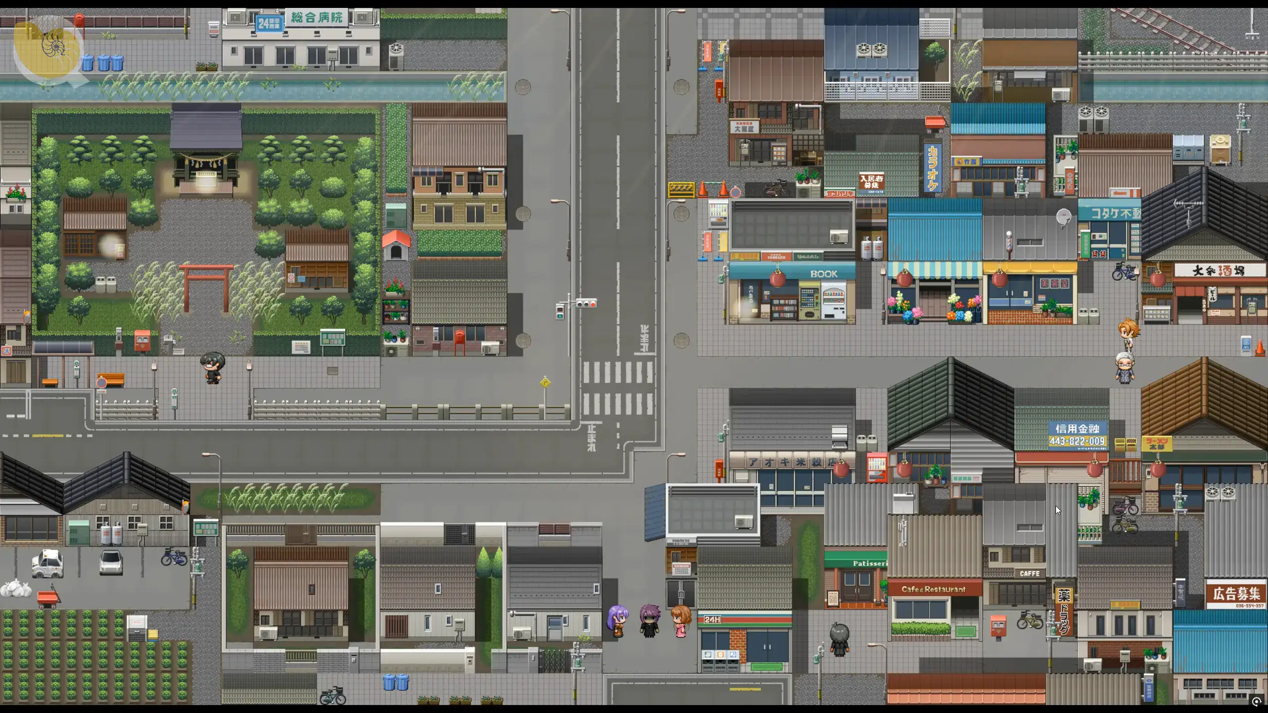 俯視視角的商店街地圖畫面,可前往商店街、神社與中古道具店進行行動|俯视视角的商店街地图画面,可前往商店街、神社与中古道具店进行行动|商店街や神社、中古ショップを移動できる俯瞰マップ画面|Top-down town map showing access to shopping street, shrine, and second-hand shop