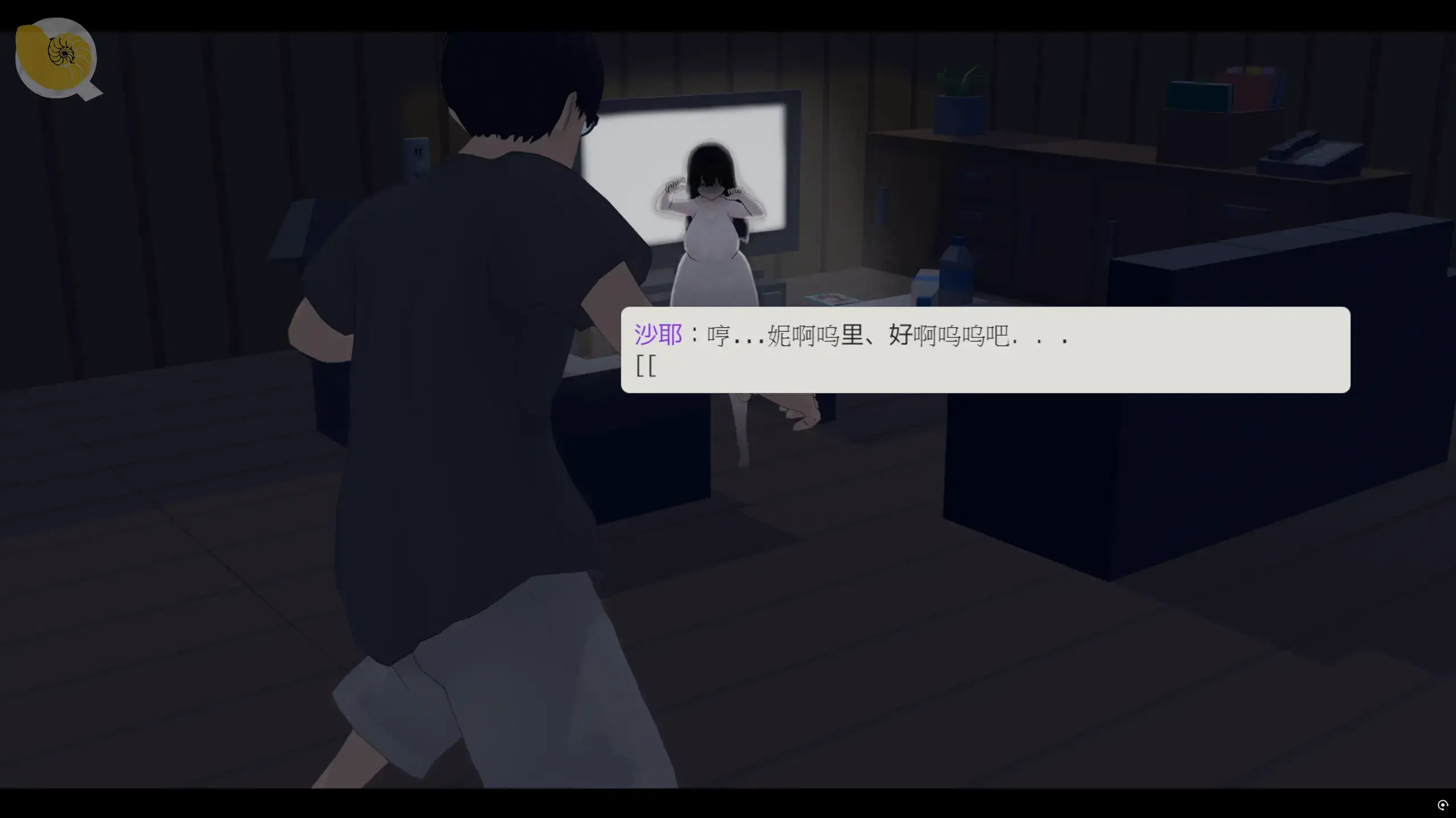 女幽靈在室內以輕鬆可愛姿態與主角互動的日常劇情畫面|女幽灵在室内以轻松可爱姿态与主角互动的日常剧情画面|室内で可愛らしい雰囲気を見せる女幽霊の日常シーン|A casual daily-life scene showing the ghost acting cute indoors